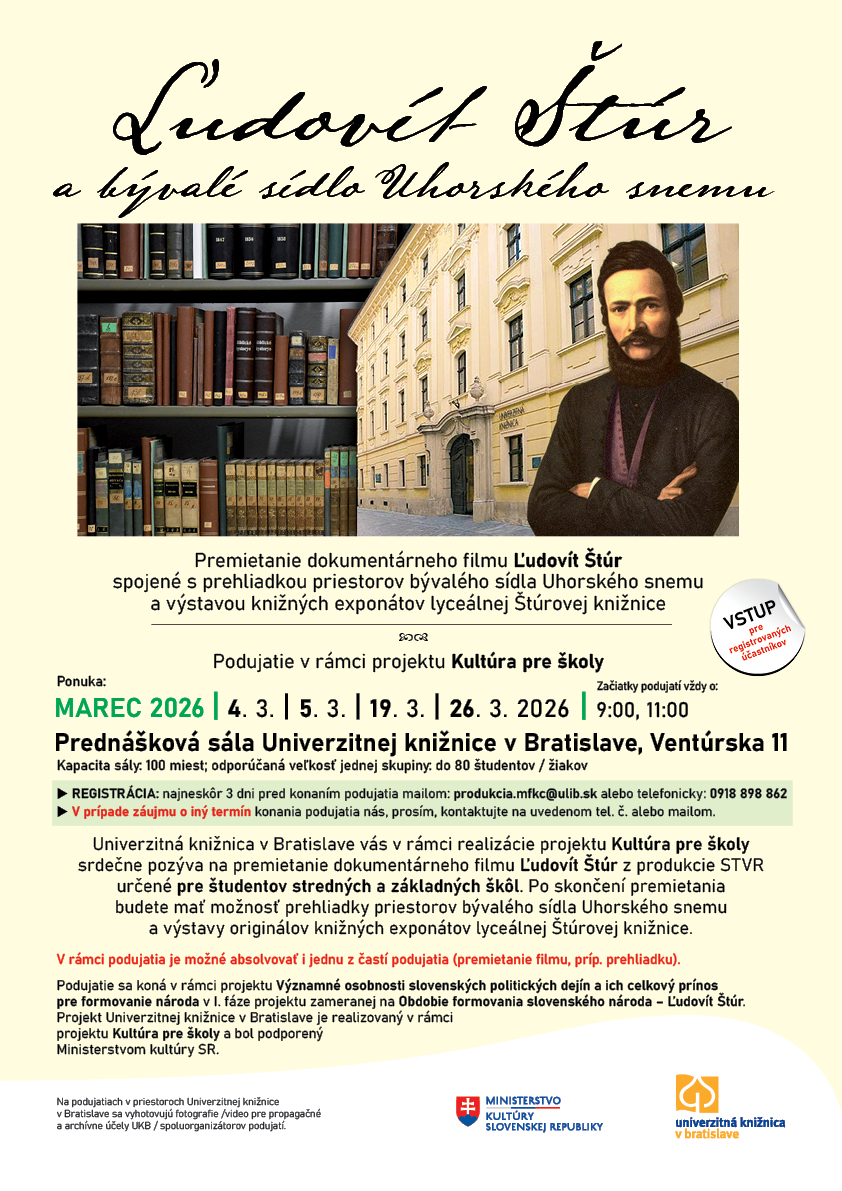 Ľudovít Štúr a bývalé sídlo Uhorského snemu – ponuka Univerzitnej knižnice v Bratislave pre školy na marec 2026
