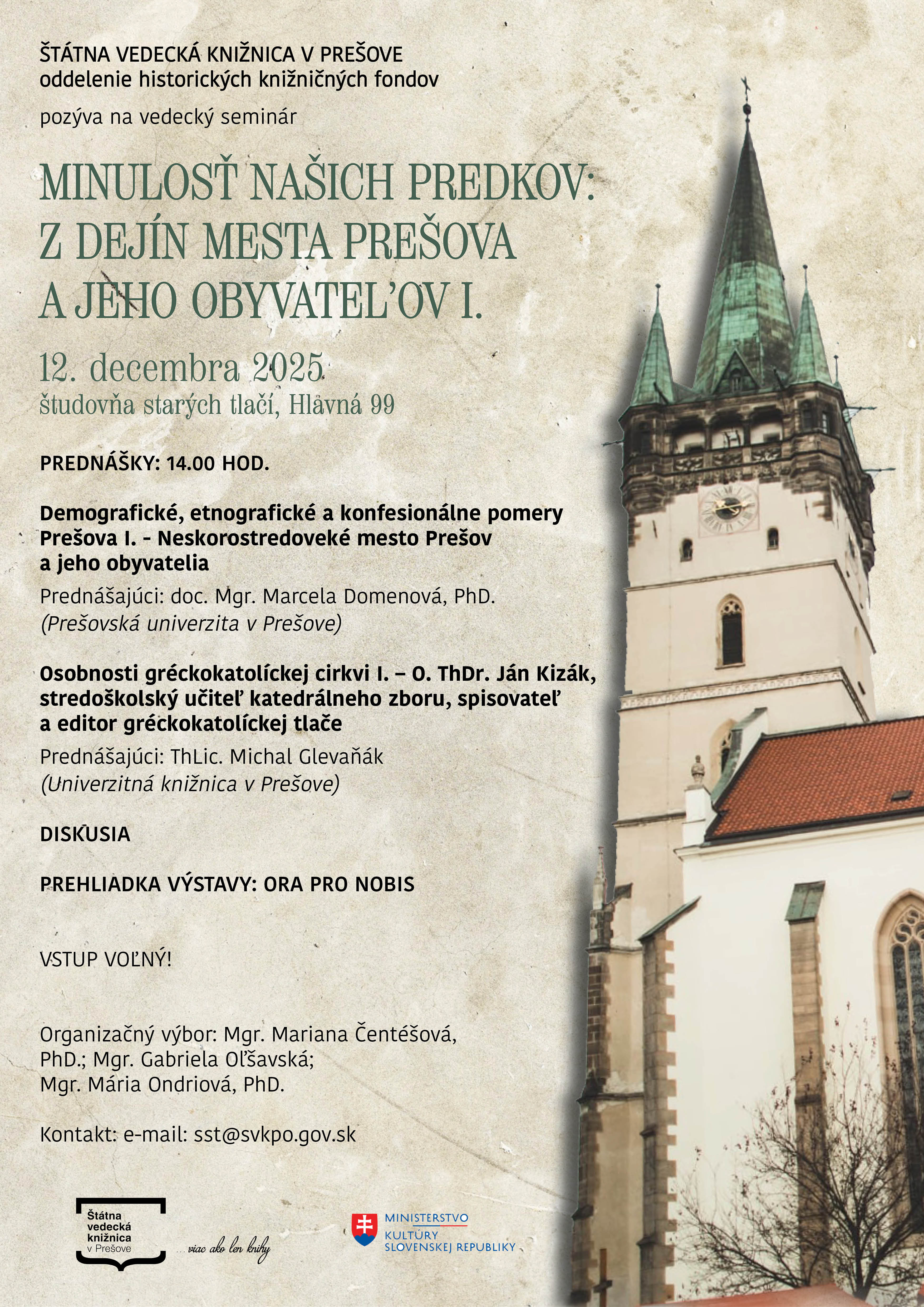 Štátna vedecká knižnica v Prešove, oddelenie historických knižničných fondov usporiada dňa 12. decembra 2025 o 14. 00 hod. vedecký seminár s názvom Minulosť našich predkov: z dejín mesta Prešova a jeho obyvateľov I., ktorý sa bude konať v študovni...