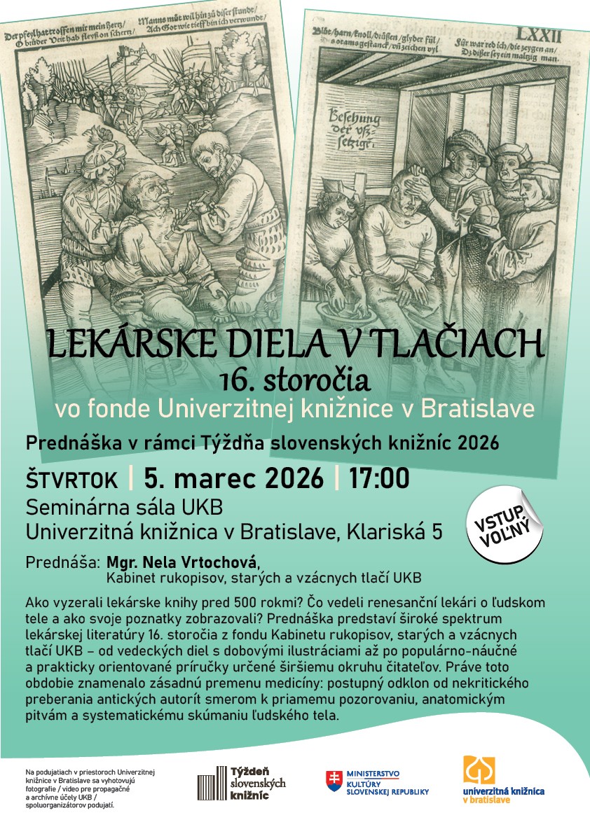 ŠTVRTOK / 5.3.2026 / 17:00 hod. Lekárske diela v tlačiach 16. storočia vo fonde Univerzitnej knižnice v Bratislave Prednáška Ako vyzerali lekárske knihy pred 500 rokmi? Čo vedeli renesanční lekári o ľudskom tele a...