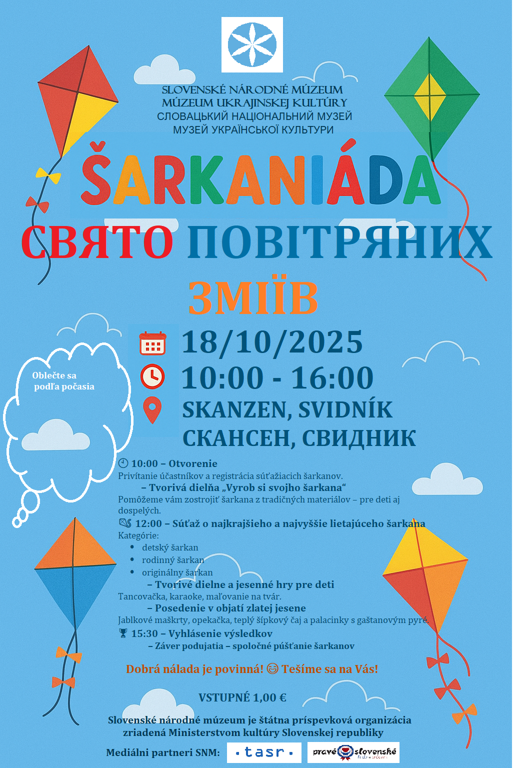 Srdečne Vás pozývame do skanzenu SNM – Múzea ukrajinskej kultúry vo Svidníku na tradičné rodinné podujatie Šarkaniáda v skanzene! V sobotu, 18. októbra, od 10:00 do 16:00 h Vás čaká bohatý program. Príďte si zabehať a zalietať so svojím šarkanom,...