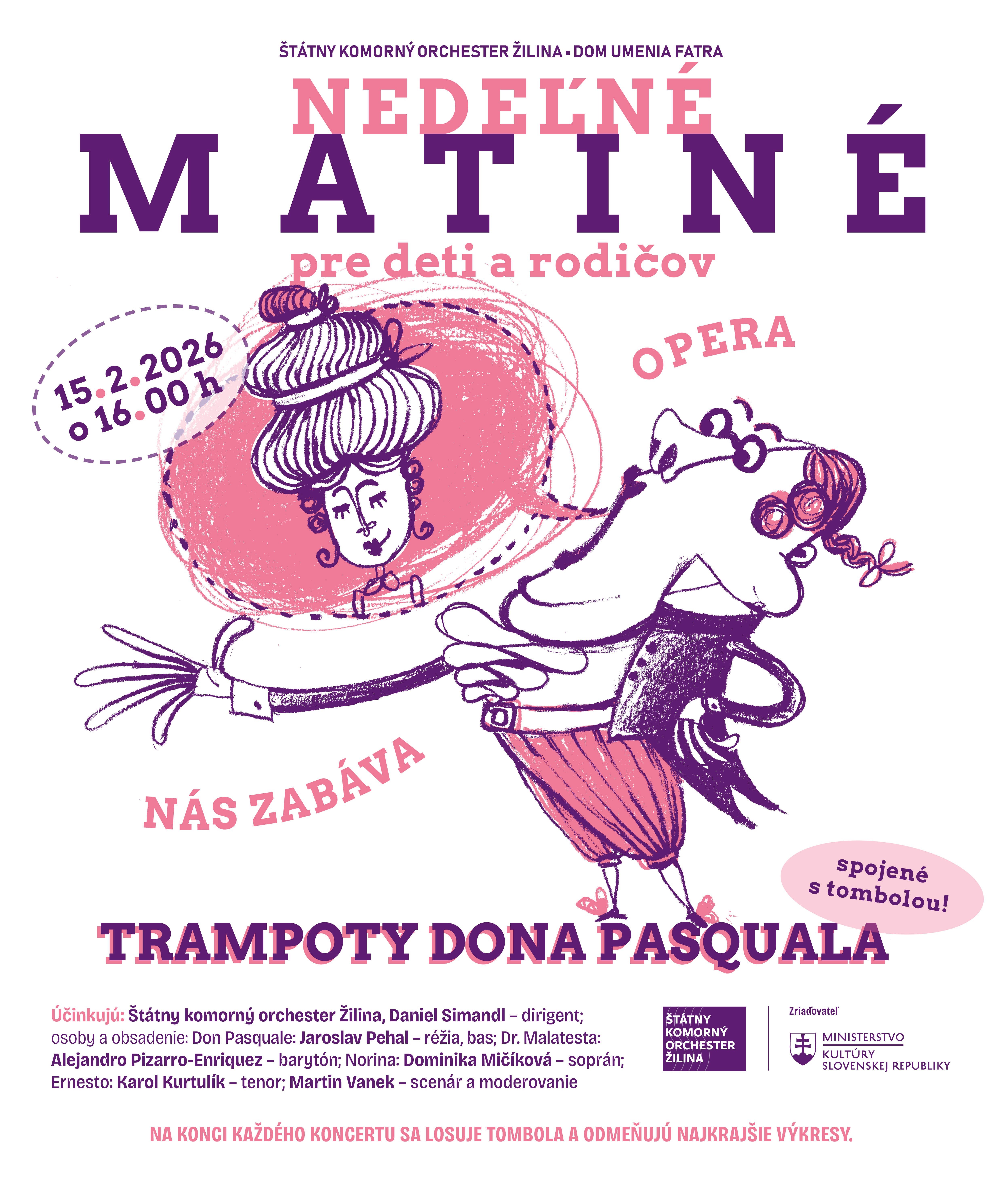 Trampoty dona Pasquala ožijú 15. februára 2026 o 16.00 v rámci cyklu „Opera nás zabáva“ a ponúknu nevšedný hudobný zážitok pre celú rodinu. Skrátená detská verzia slávnej komickej opery G. Donizettiho predstaví postavy Dona Pasquala, Noriny, Ernesta a Dr. Malatestu v podaní špičkových spevákov pod vedením dirigenta Daniela Simandla, pričom scénar a moderovanie pripravuje Martin Vanek. Predstavenie spája humor, hudbu a interaktívny prístup, aby si ho užili deti aj dospelí.