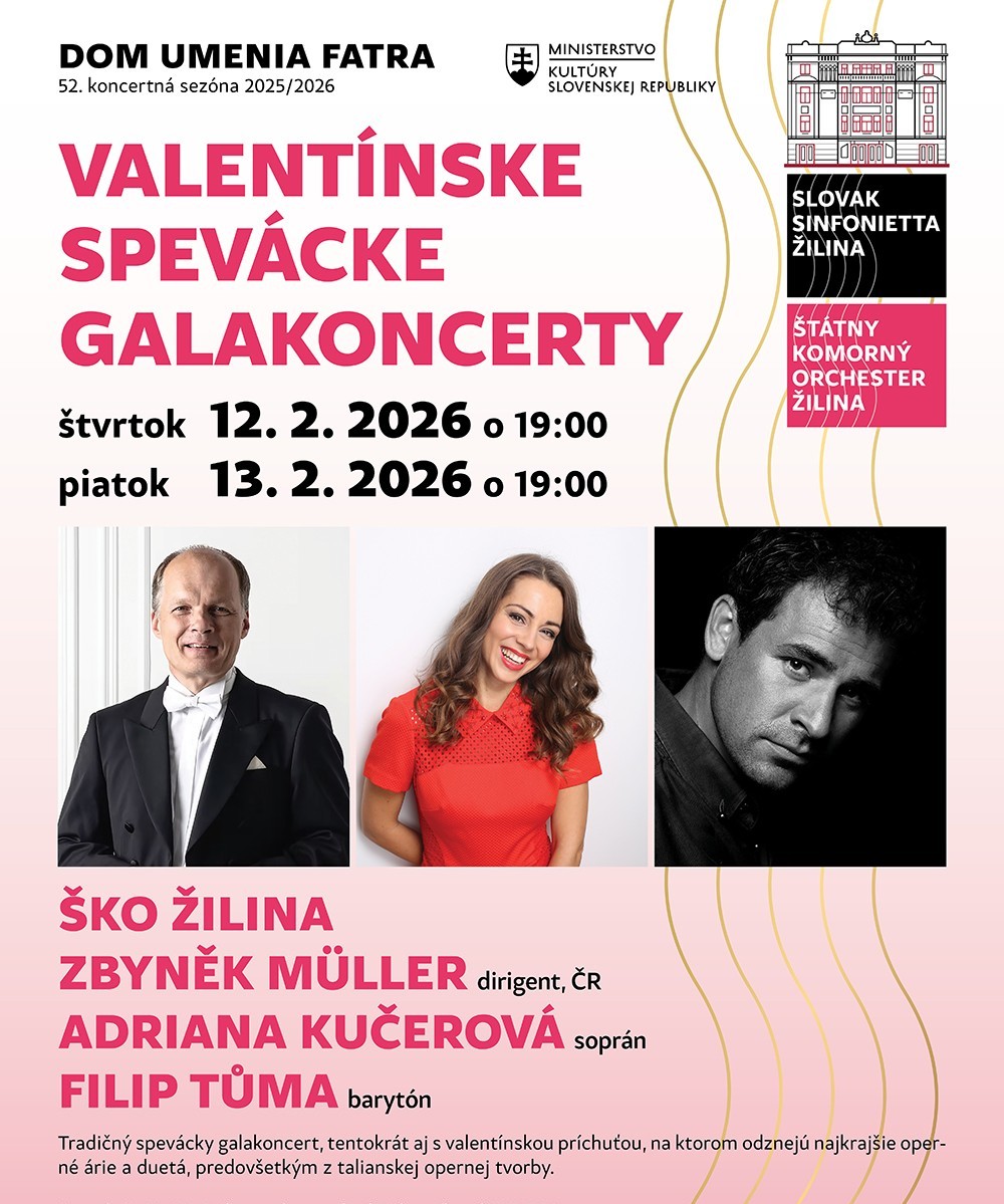 Tradičné spevácke galakoncerty 12. a 13. februára 2026 o 19.00 pod vedením českého dirigenta Zbyňka Müllera prinesie vystúpenia sopranistky Adriany Kučerovej a barytonistu Filipa Tůmu, ktorí predstavia výber najkrajších operných árií, duet a slávnych piesní. Galakoncert s valentínskou príchuťou sľubuje nezabudnuteľný večer plný hudobných emócií a krásy.