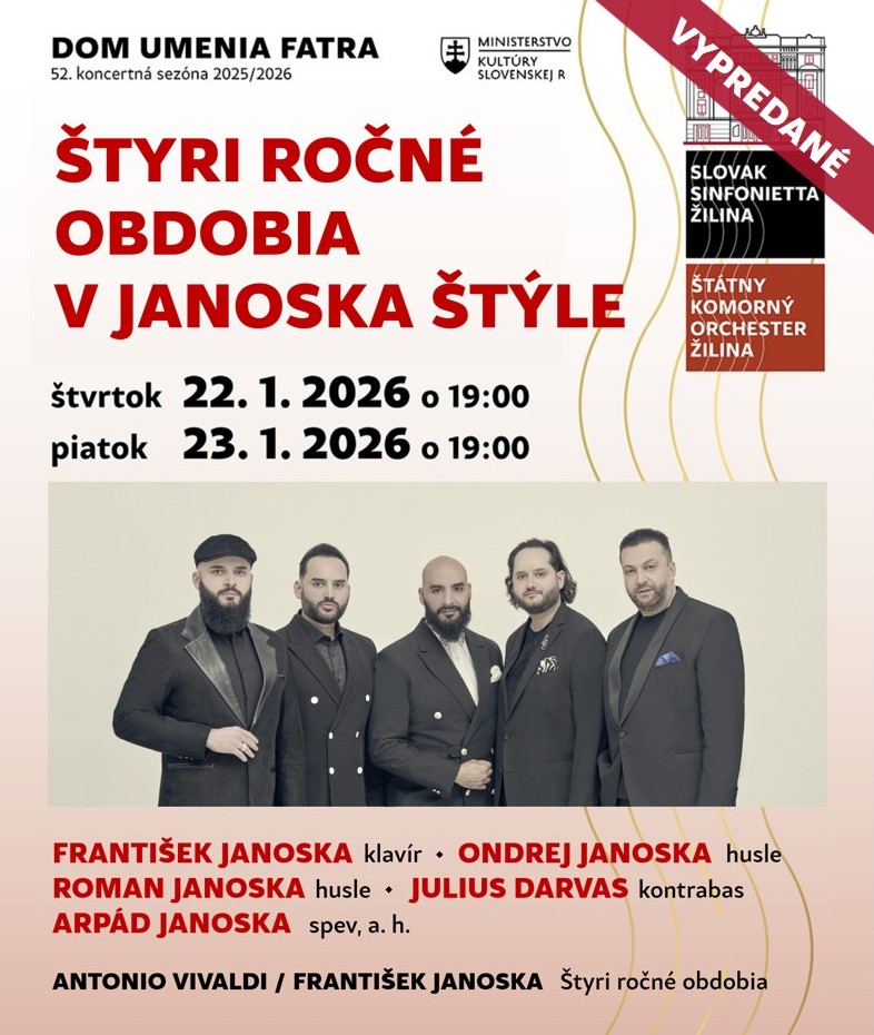 Janoska Ensemble, ktorý tvoria bratia Ondrej, Roman a František Janoskovci spolu so švagrom Juliusom Darvasom, vytvoril jedinečný hudobný jazyk založený na virtuozite, improvizácii a žánrovej slobode. Súbor exkluzívne nahráva pre vydavateľstvo Deutsche Grammophon a za svoj debutový album Janoska Style získal zlatú platňu. Ich posledné vystúpenie v Dome umenia Fatra patrilo k najvýraznejším udalostiam sezóny 2022/2023. Ako hosť večera sa predstaví spevák Arpád Janoska.
