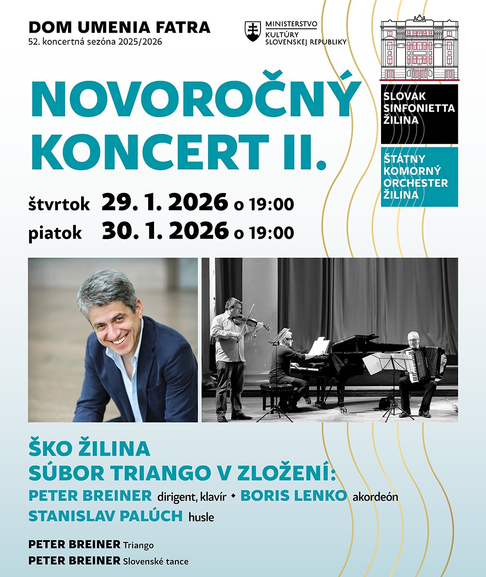 Záver januára bude patriť Novoročnému koncertu II. v rytme tanga a slovenských tancov. V Dome umenia Fatra vystúpi po takmer ôsmich rokoch medzinárodne uznávaný súbor Triango v zložení Peter Breiner (dirigent, klavír), Boris Lenko (akordeón) a Stanislav Palúch (husle). Program ponúkne diela Petra Breinera Triango a Slovenské tance v energickom a dramaturgicky atraktívnom prevedení.