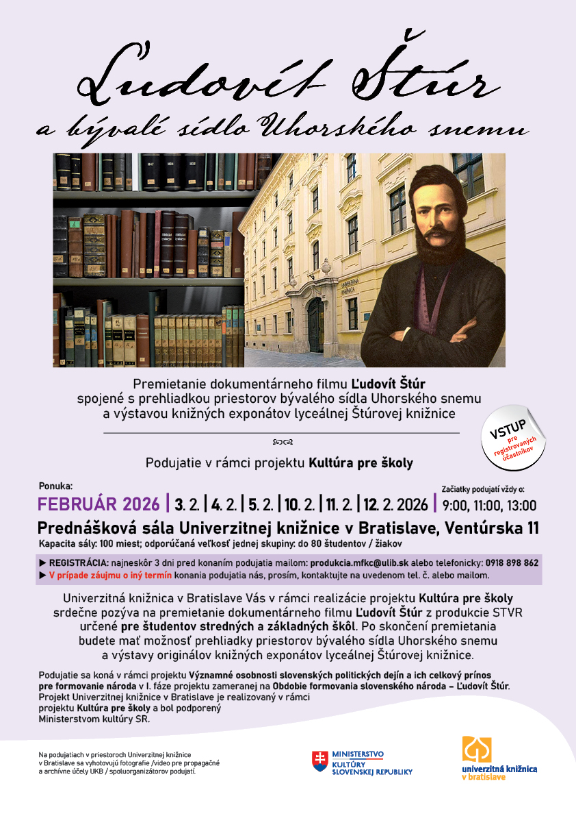 Univerzitná knižnica v Bratislave Vás v rámci projektu Kultúra pre školy srdečne pozýva na premietanie dokumentárneho filmu Ľudovít Štúr z produkcie STVR určené pre študentov stredných a základných škôl. Po skončení premietania budete mať možnosť prehliadky priestorov bývalého sídla Uhorského snemu a výstavy originálov knižných exponátov lyceálnej Štúrovej knižnice.