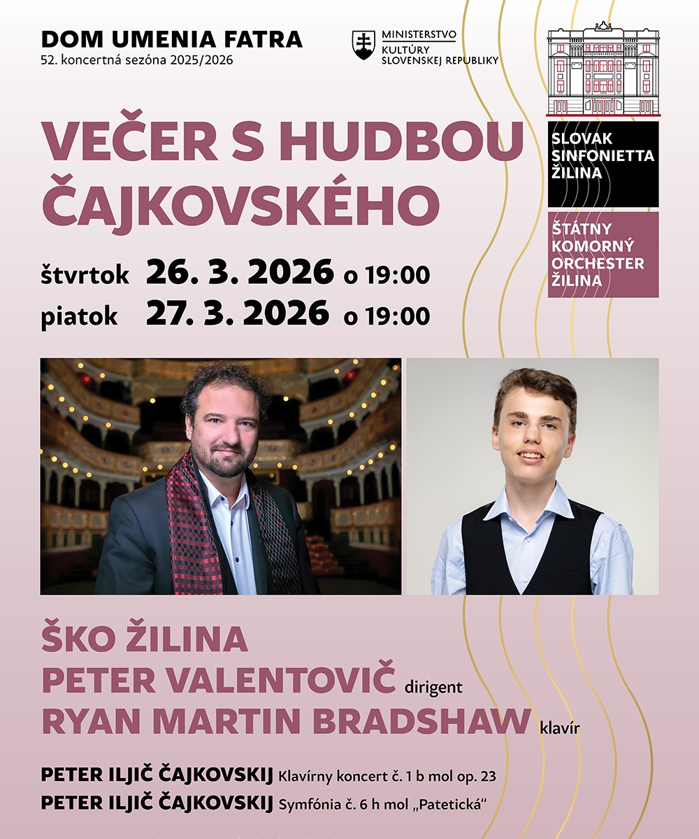Vrcholom mesiaca bude Večer s hudbou Čajkovského – 26. a 27. marca 2026 o 19:00. Pod taktovkou medzinárodne renomovaného šéfdirigenta opery ND v Košiciach – Petra Valentoviča zaznenie slávny Klavírny koncert b mol a Symfónia č. 6 „Patetická“ od Petra Iljiča Čajkovského, po prvýkrát spoločne v Žiline. Sólistom večera bude skvelý 19-ročný klavirista slovensko-austrálskeho pôvodu, laureát 19-tich medzinárodných klavírnych súťaží – Ryan Martin Bradshaw.