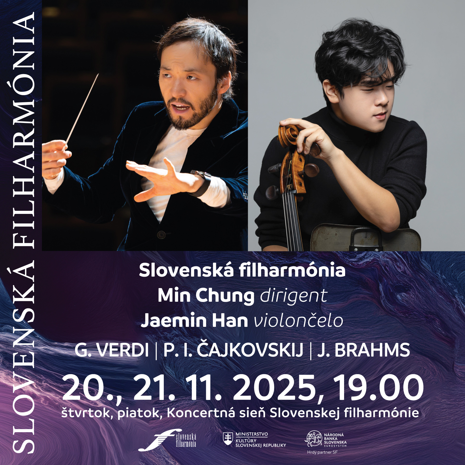 Symfonická dvojica koncertov je na programe vo štvrtok a piatok 20. a 21., novembra 2025 o 19.00. Po boku orchestra Slovenská filharmónia sa debutovo predstavia dvaja kórejskí umelci, dirigent Min Chung, ktorý má na svojom konte úspešné spolupráce s opernými domami ako Teatro alla Scala, kórejská národná opera či Teatro Politeama Greco v Lecce a violončelista Jaemin Han, ktorý sa nedávno predstavil po boku Českej filharmónie v Prahe a na ázijskom turné orchestra. Dvadsaťročný mimoriadne talentovaný kórejský umelec Jeamin Han je víťazom Grand Prix na súťaži George Enescu International Competition. V jeho interpretácii si vypočujeme Čajkovského Variácie na rokokovú tému pre violončelo a orchester, op. 33, ktoré skladateľ skomponoval pre svojho kolegu z petrohradského konzervatória, nemeckého pedagóga Wilhelma Fitzenhagena. Práve v jeho úprave sa dielo dnes hráva. Program doplní Verdiho predohra k opere Sila osudu a Serenáda č. 1 D dur, op. 11 Johannesa Brahmsa, ktorú skladateľ pôvodne komponoval ako dielo pre komorné obsadenie sláčikových a dychových nástrojov. Orchestrálna verzia vznikla neskôr.