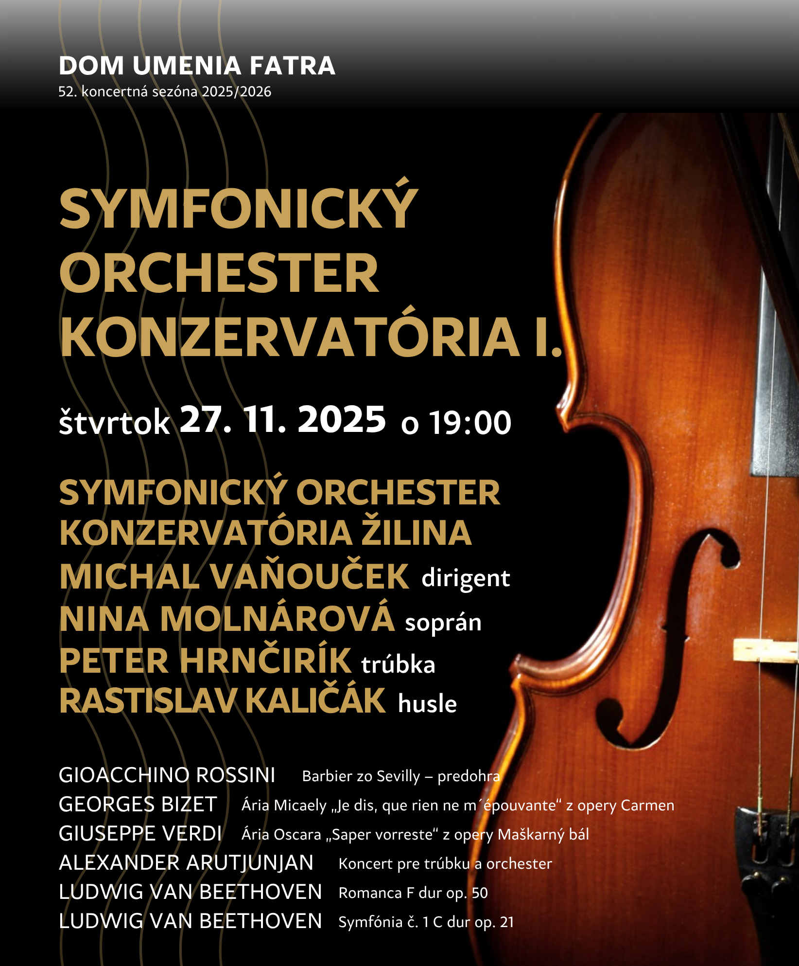 Symfonický orchester Konzervatória Žilina pod taktovkou dirigenta Michala Vaňoučka, predvedie diela Rossiniho, Beethovena, Verdiho a diela ďalších skladateľov na tradičnom predvianočnom koncerte konzervatória vo štvrtok 27. novembra 2025 o 19:00. Ako sólisti sa predstavia sopranistka Nina Molnárová, Peter Hrnčirík na trúbke a Rastislav Kaličák na husliach.