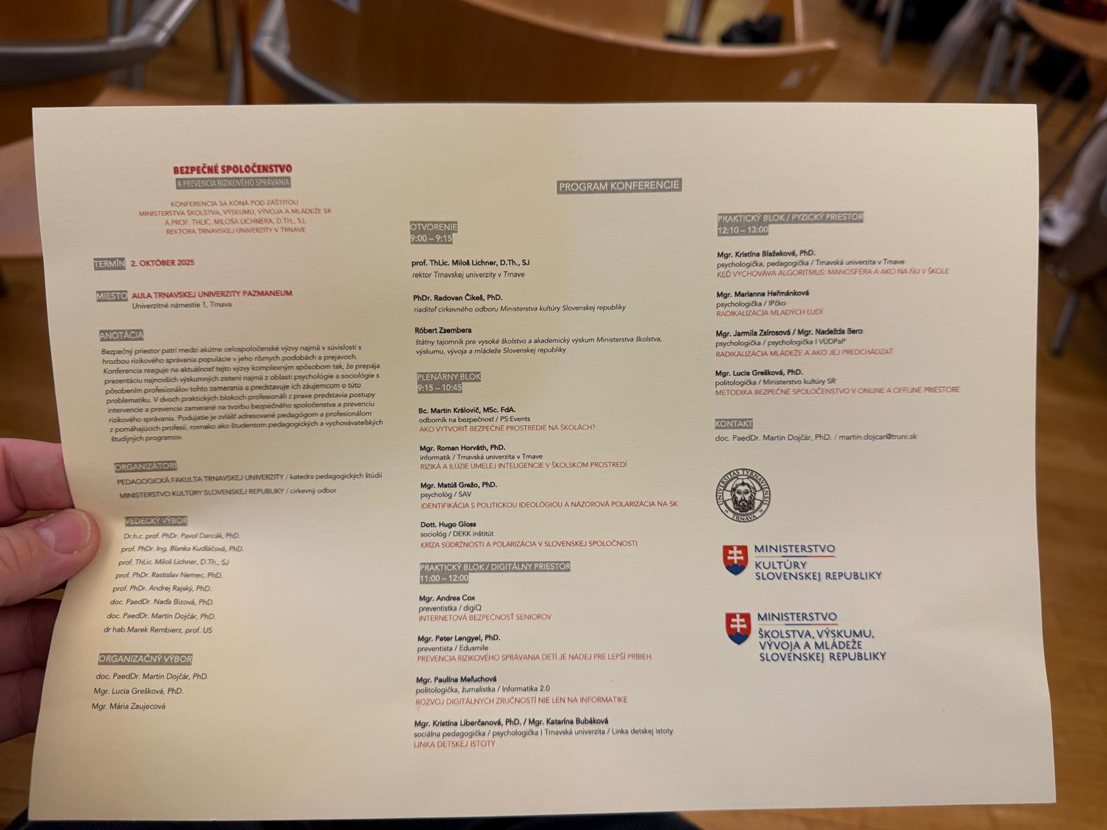 Konferenciu otvoril aj Radovan Čikeš, riaditeľ cirkevného odboru MK SR, ktorý svojim príhovorom podčiarkol význam bezpečného spoločenstva a prevencie rizikového správania.